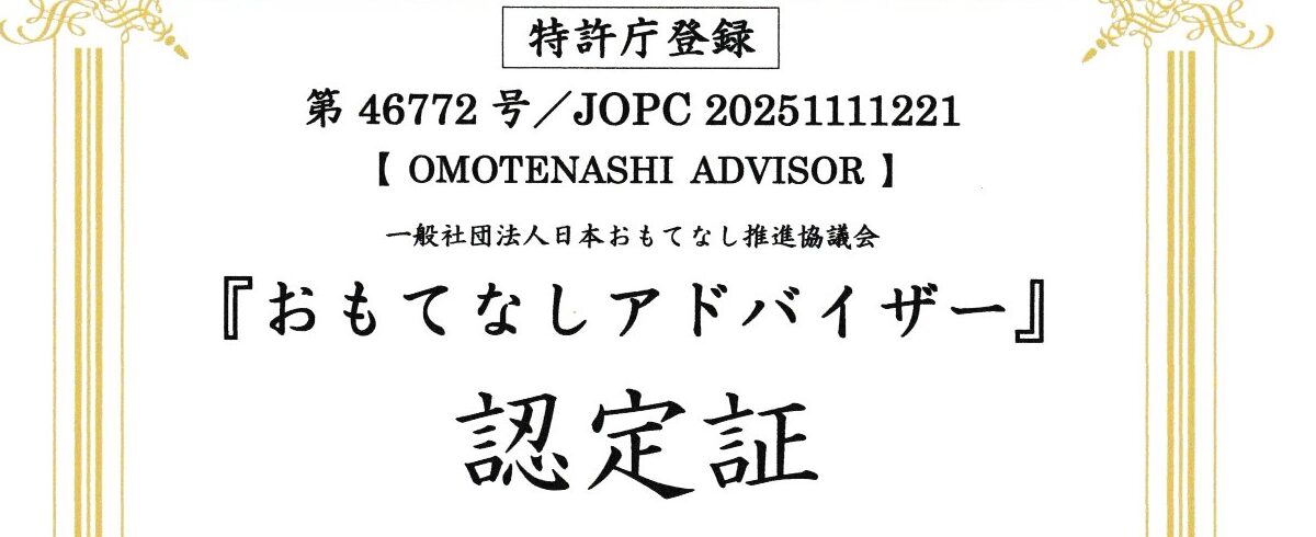 このたび、上尾商工会議所主催・㈱さくらコミュニケーションズの古川 智子氏によるカスタマーハラスメント対策セミナーを受講し、一般社団法人日本おもてなし推進協議会「おもてなしアドバイザー」認定証をいただきました。(特許庁登録 […]